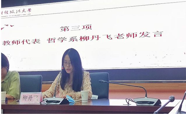 哲学系副主任柳丹飞老师作为教师代表发言。她结合自己的经历与大家分享了三点体会:一是要多尝试、多感受、多体会,不怕困难,坚定前行;二是要有目标、有计划、有恒心,学会规划自己的人生;三是要讲理想、讲情怀、讲担当,努力成为一个眼里有光、心中有爱、脚下有方向的新青年。