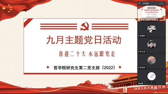 (通讯员王雨萌)9月15日,研究生第二党支部在腾讯会议平台开展线上主题党日活动。本次主题党日活动以“喜迎二十大永远跟党走——深入学习贯彻习近平总书记考察湖北重要讲话精神,推进落实湖北省第十二次党代会决策部署”为主题,活动由支部副书记王雨萌主持,支部全体党员参加。