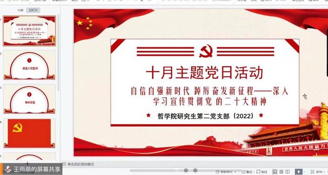 (通讯员 李文惠 李雪珂)10月28日晚上,哲学院研究生第二党支部依托腾讯会议平台开展线上主题党日活动。本次活动的主题为“自信自强新时代 踔厉奋发新征程——深入学习宣传贯彻党 的二十大精神”,由支部副书记王雨萌主持,支部全体党员参加。