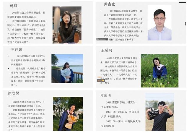 就职于日照市文化旅游局的韩凤,结合自身求职经历,从保持良好心态、坚定理想信念、持续关注信息三个方面进行分析,提出综合考虑自身优势和就业环境,做到“考公”和“求职”两手抓,积极争取就业机会。在三峡集团担任党建专员一职的黄鑫宽,分享了他在党务工作上的求职攻略,重点剖析了党建面试的重点考察内容以及面试技巧,强调党建工作“站起来能讲,坐下来能写”的标准。就职于国家税务总局荆州市荆州区税务局的王佳媛,从招聘信息、公考经验、工作内容三方面展开,她认为招聘信息不应只局限在校招网站,还应关注各个地区的人才引进和事业单位政策,扩宽信息渠道;同时,她就自己的备考过程和税务局的工作内容进行了详细讲解。在武汉市第三实验中学工作的王璐珂,重点分析了不同地区、不同年级对政治老师的需求,提出相应的备考方向,还分享了提升教学技能学习网站。在湖北邮政武汉市分公司工作的徐欣悦,从明确目标、制定学年规划,求职秉承相应原则,岗位不同、简历不同三方面着手分享求职经验。同时,她也分享了公考经历,强调积极参加面试的诸多益处。目前担任中南民族大学专职辅导员的叶煊瑞,从求职经历、选择原因、工作感受以及如何备考四方面进行分析,还分享了大量备考资源。