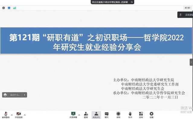 (通讯员 李敏)为进一步帮助我校研究生树立正确就业观,提前做好职业生涯规划,助力实现更高质量、更加充分的就业,11月3日晚7:30,由研究生院、党委研究生工作部、校研究生会主办,哲学院研究生会承办的第121期“研职有道”之研究生就业经验分享交流会在线上腾讯会议成功举办。本次分享会邀请了2021届毕业生叶煊瑞,2022届毕业生韩凤、黄鑫宽、王佳媛、王璐珂、徐欣悦进行经验分享。此次分享会由哲学院研究生会主席黄保凯主持,辅导员王路芳及学院各年级研究生参加。