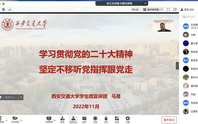 支部邀请西安交通大学微宣讲团(筑梦社)马勇同志为支部成员讲授主题党课。马勇同志以“学习贯彻党的二十大精神,坚定不移听党指挥跟党走”为主题,详细介绍了二十大报告的主要内容、整体结构以及内在逻辑,强调要认真学习贯彻党的二十大精神,既要整体把握、全面系统,又要突出重点、抓住关键。希望各位党员同志通过学习,把“两个确立”“两个维护”作为党的最高政治原则和根本政治规矩,牢牢把握团结奋斗的时代要求,务必敢于斗争、善于斗争,全力战胜前进道路上的各种困难,以实际行动奋进新征程、建功新时代,不断打开事业发展新天地。