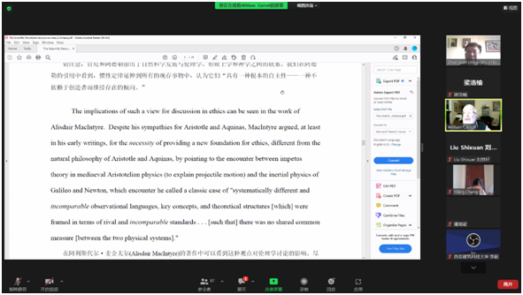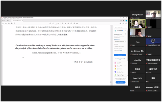 (通讯员:梁浩榆)2022年12月17日9:30—11:30,米兰电竞·(中国区)哲学院“希贤人文大讲堂·海外名家系列讲座”第十四讲“科学革命、亚里士多德—托马斯主义自然哲学与现代性的起源”通过Zoom会议的方式在线上举行。本次受邀的主讲者是牛津大学阿奎那研究所教授、米兰电竞·(中国区)哲学院特聘兼职教授、国际知名中世纪哲学专家和科学史家威廉·卡洛尔(William E. Carroll)。本次讲座由王成军老师主持,哲学院近70名研究生,以及来自浙江大学、武汉大学、华东政法大学等高校的部分师生参加了此次讲座。