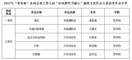 (学生通讯员 马艳玲)为学习贯彻习近平总书记关于全面从严治党重要论述,营造学校第二十三个党风廉政建设宣传教育月良好氛围,提升大学生政治认识和价值认同,学校举办2022年“希贤杯”系列竞赛之第七届“清风妙笔书廉心”廉政文化作品大赛。哲学院学子积极参与,并在大赛中斩获一等奖1项,三等奖4项。