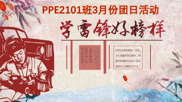 本次团日活动以”学习雷锋精神“为主题,深入学习了雷锋“全心全意为人民服务”的奉献精神,号召同学们在日常生活中践行雷锋精神,团支部将继续发挥引领作用,带领支部成员成为有时代担当的青年。