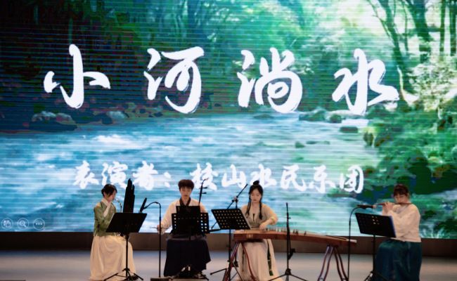 晚会进入第三篇——“扬帆启航”。开篇,由山水民乐团姚力钰、施玲、王铭妤和程小航带来民乐合奏《小河淌水》,其曲如春风沁人心田。