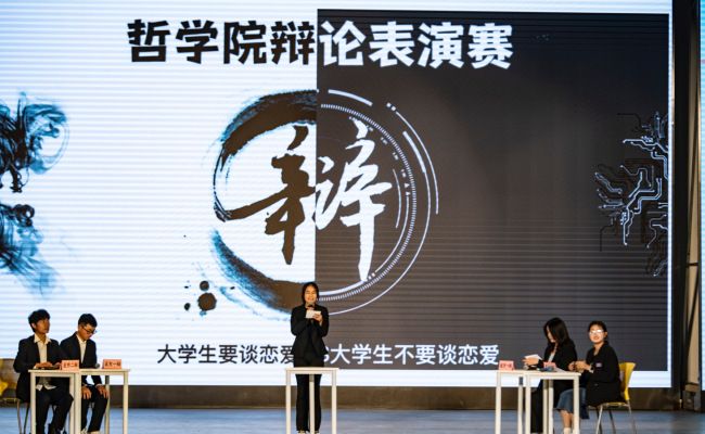 随之其后的是哲学院辩论队龚雨荷、窦晨纹、李佳贺、陈铭豪和江楠带来的辩论表演赛《大学生要不要谈恋爱》,四位辩手谈到恋爱,笑点不断,晚会气氛再上高潮。