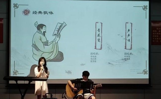 第二个环节是“悟——词语精妙”,趣味的游戏环节让支部成员感受到了中华文化的悠长韵味。第三个环节是由吉他协会带来的“唱——经典歌颂”,在动人的歌声中,支部成员领悟到了传统优秀诗词经典与当代潮流音乐碰撞的魅力。