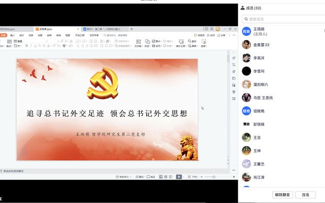 接着,王雨萌同志主讲“哲理研声”之“我看新时代”主题党课第15期。为深入学习贯彻习近平新时代中国特色社会主义思想和党的二十大报告,王雨萌同志围绕“追寻总书记外交足迹 领会总书记外交思想”主题,带领支部成员回顾了习近平总书记十八大以来的外交足迹,以及强调习近平总书记“胸怀天下,命运与共”、“战略引领,把舵定向”、“团结合作,互利共赢”、“坚持原则,敢于斗争”的外交思想。最后,王雨萌同志号召全体党员要在思想上始终坚持中国特色社会主义道路和制度,时刻坚定自身党性;行动上“不忘初心、牢记使命”,立志做有理想、敢担当、能吃苦、肯奋斗的新时代好青年。