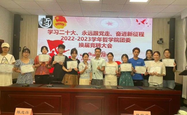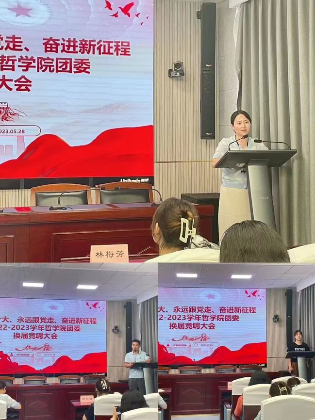 (学生通讯员:王瑾瑾)5月28日晚六点半,哲学院团委在文沛楼二楼会议室开展2022-2023学年“学习二十大、永远跟党走、奋进新征程”换届竞聘大会。哲学院团委书记陈意萍、哲学院2022级本科生辅导员汤彪、哲学院团委副书记林梅芳以及团委各部门部长、副部长、换届竞聘干事们出席了本次大会。