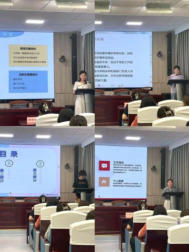 所有竞聘者答辩完成后,林梅芳师姐首先分享了自己在团委工作的收获,尤其是文书撰写能力的提升,她提到自己在进行“返家乡”实践时,文书写作得到了当地领导的大力赞许。