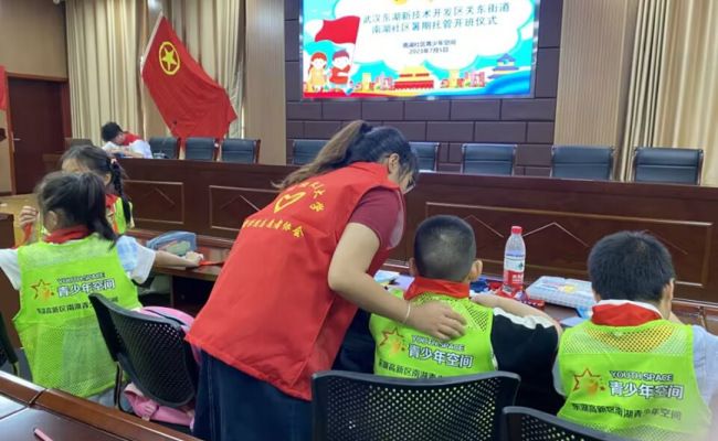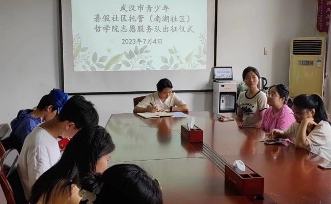 据悉,为做好本次南湖社区暑期托管志愿服务,哲学院志愿者协会提前面向全校招募、选拔了近十位志愿者,并对志愿者进行了专业培训。7月4日,哲学院在文沛楼319会议室举行了哲学院“南湖社区暑期托管”志愿服务队出征仪式,院团委书记陈意萍老师对志愿者们开展行前培训。在接下来的托管志愿服务中,志愿者们将对托管室学生开展课业辅导、情感陪伴、心理疏导等活动,并结合学院学科特色以及团学活动特色开展哲学启蒙、手工创作等特色课程,陪伴孩子们度过充实快乐的假期。