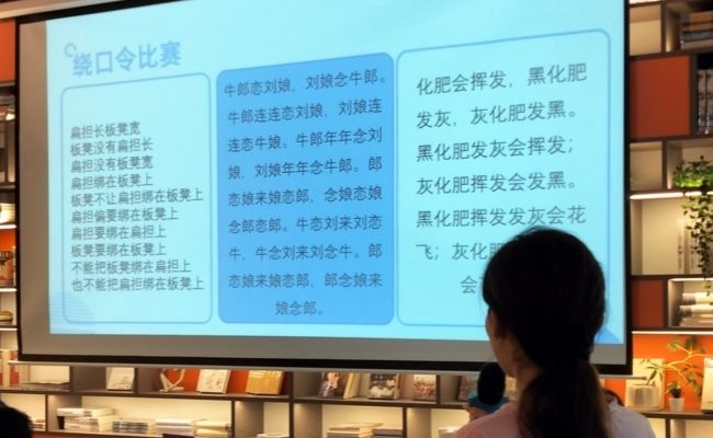 第三个环节是推广普通话主题教育。该环节以科普推广和趣味活动相辅相成。首先是生僻字辨读和绕口令两个互动环节,激发了同学们的学习兴趣。接着王婧巧介绍了普通话的历史和推广普通话的意义,让同学们对普通话有了更深层次的认识。