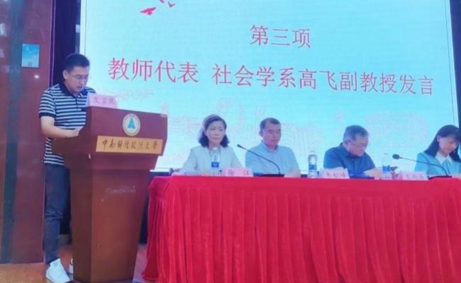 典礼进入第三项,教师代表社会学系高飞副教授上台发言。高老师以景入情,回应新生们热切的期待。他通过三个“不要”勉励新生:不要迷失自己、不要害怕失败、不要停止成长,祝福新生们在未来的四年里,找到承载自己人生意义的那颗星星,发出自己的光芒。