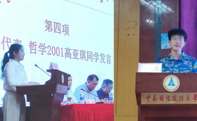随后,老生代表哲学2001班高亚琪同学发言。高亚琪同学由自身经历入手,回望过去,总结经验:持之以恒、立志明德、劳逸结合、强健体魄。她表示,犯其至远而图其至难,愿师弟师妹们在未来的道路上能够不负韶华,坚毅前行,在南湖畔边收获独一无二的风景。