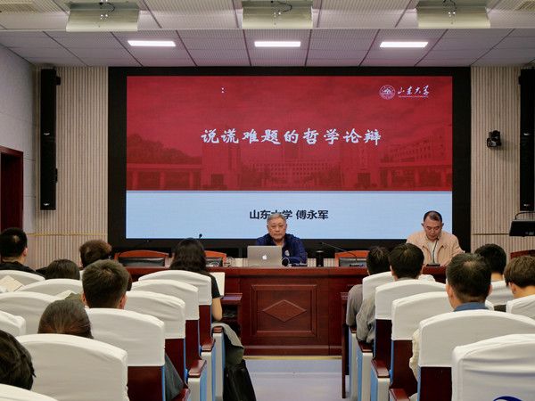 (通讯员 边媛 肖榕 摄影 余雅轩)2023年10月15日19点,山东大学哲学与社会发展学院暨中国诠释学中心教授,山东大学人文社科创新团队“文明互鉴视域中的汉语哲学”首席专家傅永军应邀于文沛楼二楼会议室进行学术讲座,讲座主题为“说谎难题的哲学论辩”。本次讲座由哲学院副院长朱松峰教授主持,周志荣副教授、王成军副教授、何建锋博士、王欣茹博士,及部分博士、硕士研究生参加。