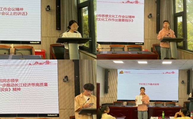 会上,谭秋月同志领学全国组织工作会议精神,重点学习了《李干杰同志在全国组织工作会议上的讲话》。肖鑫同志领学全国宣传思想文化工作会议精神,强调广大师生应深入学习贯彻习近平文化思想。柴杨航同志带领支部成员认真学习了《习近平主持召开进一步推动长江经济带高质量发展座谈会》精神,指明了全面贯彻新发展理念对于我国生态环境保护和经济社会发展的重要意义。领学结束后,肖鑫同志作下阶段工作重点安排,为大家明确了支部下一阶段的工作计划和重点方向。