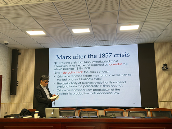 讲座内容以1850年代的危机理论为核心,围绕马克思研究经济学的背景、马克思如何研究政治经济学以及马克思的经济危机理论包含哪些方面逐层展开。在研究背景方面,教授指出,马克思在《1844年经济学哲学手稿》中通过亚当·斯密、大卫·李嘉图和约翰·穆勒等人的经济理论,已经初步接触了经济学知识。经历1847年经济危机和1848年革命,马克思期待下一次危机的爆发并希望通过经济危机重新在欧洲引发革命。然而,他对经济危机将要到来的几次预测都错误了,终于,马克思在1857年迎来了他对经济危机的第一次正确预测,这一次的危机是人类历史上第一次世界性危机,也是资本主义经济充分发展到使现代商业周期模式适用的第一个危机。正是在听闻英国经济危机爆发进而导致比尔银行法案终止的消息后,马克思开始着手撰写包括英国、德国和法国三个国家在内的有关当前经济危机的小册子。教授认为,马克思研究经济学受到德国财政学家阿尔伯特·谢芙莱(A. Schäffle)、德国哲学家弗里德里希·恩格斯(F. Engles)和英国资产阶级政治经济学家托马斯·图克(Th. Tooke)等人的影响,尤其是图克对马克思系统研究经济学影响最为重大。
