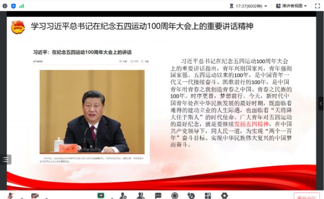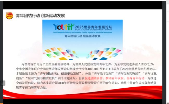 活动伊始,全体同学起立,齐唱团歌。紧接着进入活动的第二个环节,团支书通过图片和文字材料让大家学习习近平总书记致首届青年发展论坛的重要贺信,了解青年数字发展论坛的代表发言。在此之后,进一步学习习近平总书记在纪念五四运动100周年的重要讲话。青年孕育无限希望,青年创造美好明天。落实全球发展议程,解决人类面临的共同挑战离不开青年的积极参与,离不开我们每一个人的努力奋斗。