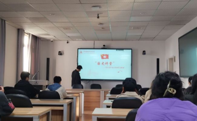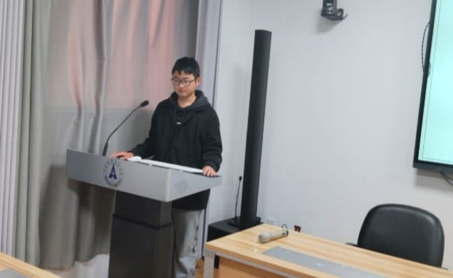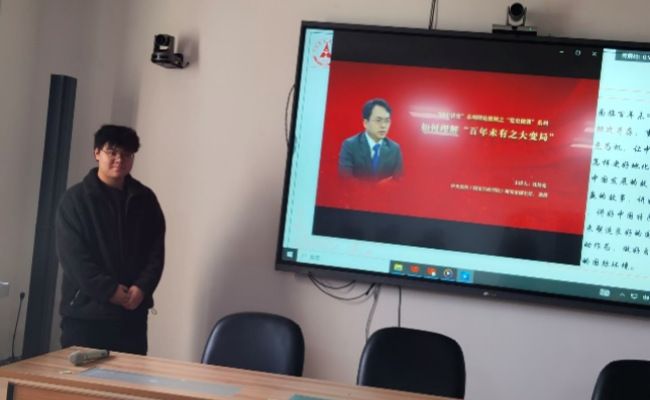 其次,陶屹程开展“国史讲堂”,学习党中央发布的党史微课,按时问顺序讲述国家每一阶段取得的伟大成果以及党的正确领导政策和切实行动的落实。陈铭豪作为学生代表发言,表达了青年团员对党的拥护,坚定团员们听党话、跟党走的人生追求。