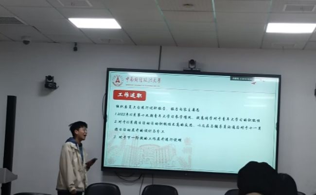 而后,由组织委员王子超作十一月工作述职报告。主要内容有:2023年10月第十九期青年大学习参学情况,提高同学对于青年大学习的积极性;对于10月团日活动活动积极性不高的反思,以及在与辅导员沟通后对于十一月团日活动展开的设计与分工。7