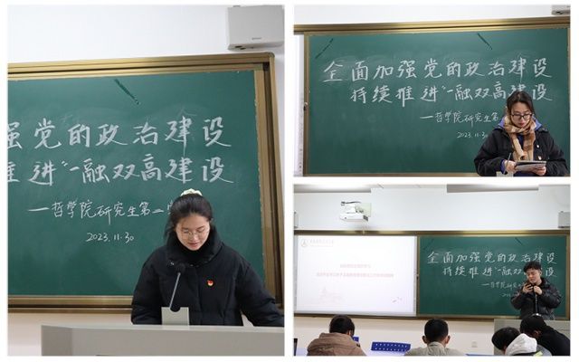 (通讯员 唐烨)2023年11月30日上午,哲学院研究生学生第二党支部在文澴楼506教室组织开展11月主题党日活动,本次党日活动的主题为“全面加强党的政治建设,持续推进‘一融双高’建设”。会议由支部副书记李郅君同志主持,支部全体党员参加。
