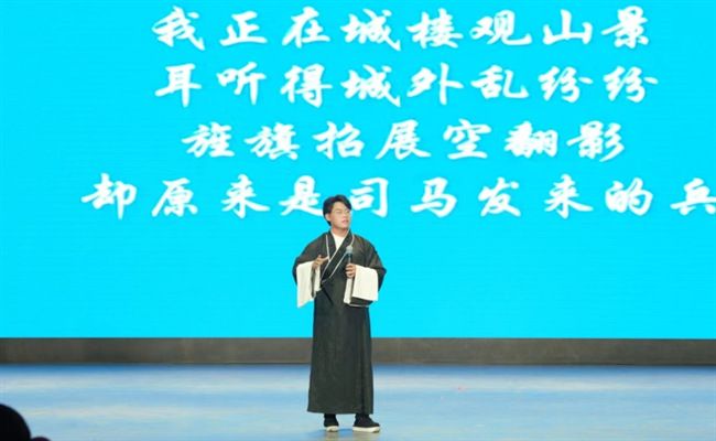 司绍文献唱京剧《空城计》选段“我正在城楼观山景”。一折三国戏,孔明抚琴赏山景,仲达误中空城计。诸葛亮西城一曲退司马,家喻户晓,人尽皆知。