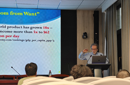 讲座在主持人王老师热情洋溢的介绍和听众们热烈的掌声中开场。一开始,Pogge教授就提醒听众注意一个令人震惊的现象,此即,我们都公认“免于贫困的自由”(freedom from want)是人的基本权利之一,然而,我们却可以观察到这一事实:从这一理念被提出并被世界广泛接受以来,世界总产品增加了18倍,全球平均收入(按PPP计算)也至少增长了5倍,然而,全球的贫困人口却不仅没有减少,反而在总体上呈现增多趋势,尽管像中国这样的人口大国已取得了伟大的减贫成就。现今,全球仍有42%的人口负担不起健康饮食(按每人每天3.66美元计),这与“联合国2030可持续发展议程”所承诺的消除贫困的目标有着非常大的差距。同时,我们也可以观察到其他一些令人忧心的现象,比如战争、生态恶化、对新技术的管控缺乏共识等。Pogge教授警告说,如果当今的我们没有道德进步(moral progress),那么,因为这些问题所带来的风险和挑战,我们人类已经取得的发展成就将付诸东流,人类将陷入非常暗淡的前景。