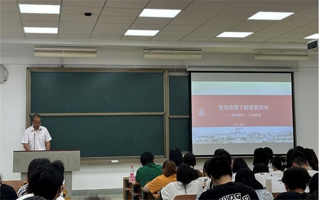 (学生通讯员:任若愚/摄影:陈玉)为深入学习贯彻习近平新时代中国特色社会主义思想,引导毕业生认清就业形势,增强就业能力,树立正确的就业观,5月16日下午,校就业指导服务中心主任温习于文泰楼201,为哲学院2025届毕业生讲授《变局形势下的求职应对》就业思政课。校就业指导服务中心全体工作人员,哲学院党委书记刘琳琳、党委副书记徐江、全体辅导员及2025届全体本科毕业生、研究生毕业生参加了本次活动。
