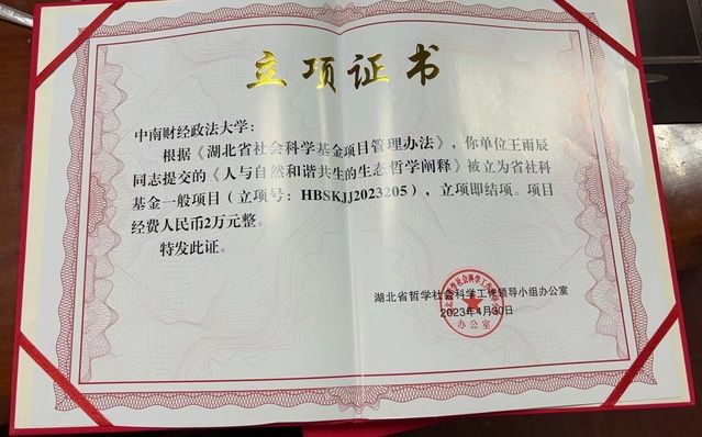 经湖北省哲学社会科学工作领导小组批复,我院王雨辰教授承担的《人与自然和谐共生的生态哲学阐释》被立为省社科基金一般项目(立项号:HBSKJJ2023205),立项即结项。项目经费人民币2万元整。