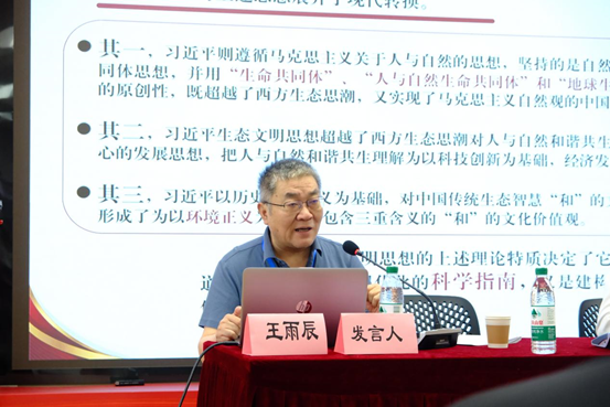 开幕式后,郇庆治教授、王雨辰教授、方世南教授、钟贞山教授、陈学明教授相继做了主旨报告,就“中国生态文明建设”、习近平生态文明思想”、“新质生产力”等主题展开了深入的交流。我院王雨辰教授提出,中国形态的生态文明话语体系的建构的目的在于推进中国生态文明建设,提升全球生态文明建设的中国话语权和影响力,强调习近平生态文明思想既是对人类生态文明思想的革命性变革,又是马克思主义生态思想发展的最新阶段,是构建中国形态的生态文明话语体系的理论基础,指出中国形态的生态文明话语体系应当以捍卫中国的发展权与环境权为基本原则,既能起到促进中国生态文明建设的发展观的功能,又能起到促进全球生态文明建设的境界论的功能,实现建设美丽中国与美丽清洁世界的有机统一。