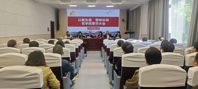 为深入贯彻党的二十大和二十届二中、三中全会精神,深入学习贯彻习近平总书记关于教师队伍和师德师风建设的重要论述以及习近平同志《论教育》有关精神,落实《中共中央 国务院关于弘扬教育家精神加强新时代高素质专业化教师队伍建设的意见》,按照学校党委要求,10月24日下午,哲学院召开“以案为鉴 警钟长鸣”警示教育大会,学习传达上级文件精神,通报相关典型案例,推动压实工作责任,进一步加强和改进师德师风建设。院领导班子全体成员参会,大会由院党委书记刘琳琳主持。