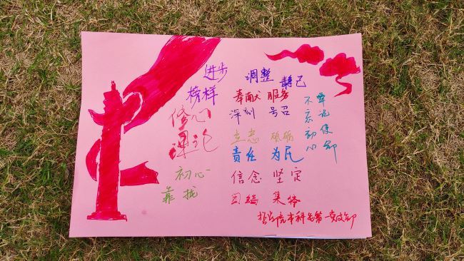 破冰热身后,进入“争当先锋”铭初心环节。成员们在白纸上描绘出自己的手掌轮廓,依次在每个手指处写下以下五个问题的答案关键词:我为什么入党?入党后我最大的变化是什么?我最敬佩的党员是谁?优秀党员具有哪些特质?如何成为合格的共产党员?作答完后,党员们依次对自己所写的关键词进行分享,其中“榜样”“先锋”“奉献”“初心”等均是高频词汇。通过思想梳理,支部成员更加坚定共产主义理想信念,更加明确了青年学子在中华民族伟大复兴征途中的责任担当。