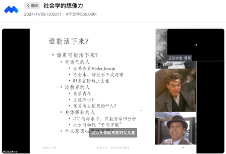 接下来,晋副教授以风趣幽默的方式提出了“什么是想象力”的问题,进而启发听众思考自己是如何坐进讲座教室这一生活现象,最终引出了“社会学的想象力”的概念。他还以“泰坦尼克号沉船事件”为代表来证实社会学的想象力在揭示社会现象本质方面的独特魅力;随后又借米尔斯关于“社会学是一门手艺”的观点引发了师生对社会实践和探索的重新思考。