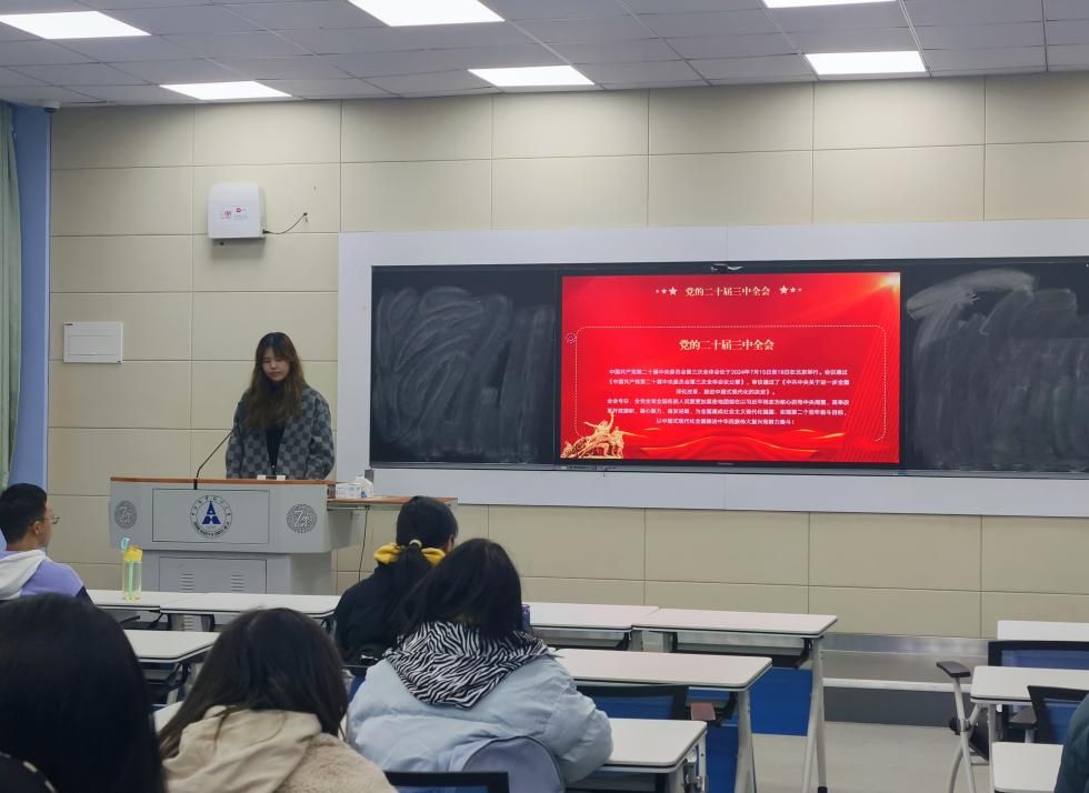 活动第二项,由孟才雅同学讲解党的二十届三中全会精神,带领同学们深入领悟党的最新理论与先进精神。同时以习近平总书记的话语鼓舞各位同学:在新征程上,当好中国式现代化建设的坚定行动派、实干家,永葆“闯”的精神、“创”的劲头、“干”的作风,在攻坚克难中成就事业、在敢闯敢干中开辟通途,共同谱写中国式现代化更加壮美的华章。