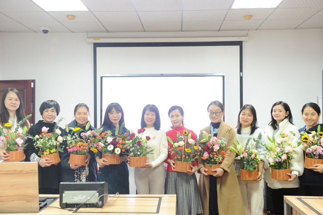 随后,花艺老师详细展示了花材大小色彩搭配、框架处理等插花技巧。女教工们一边倾听,一边跟随花艺老师的讲解动手实践,发挥想象,修枝剪叶,创意组合,将各种花材根据不同的色彩、形状、寓意有层次地搭配在一起。经过一番创作,每个人的面前都呈现出独属于自己风格的美丽花篮,形成了一道亮丽的冬日风景线。