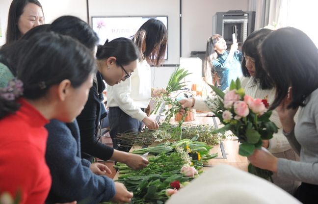 活动中,花艺培训老师首先通过介绍花材名称、生长习性,带领大家了解了各种各样的花材挑选处理和养护知识。女教工们积极认真学习,了解不同鲜花蕴含的美好寓意。