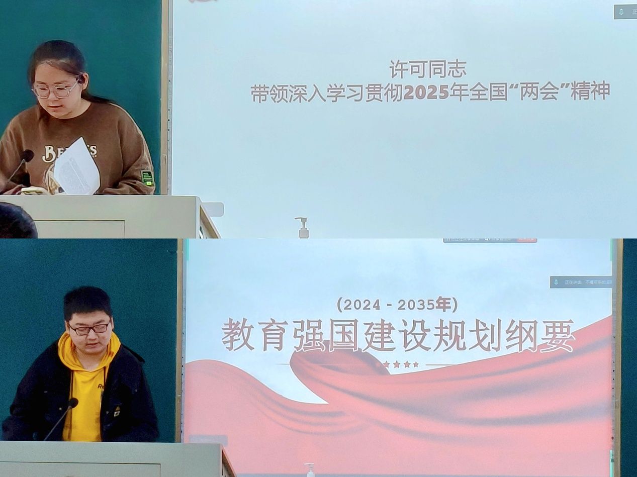 随后,闫沛志同志领学《教育强国建设规划纲要(2024—2035年)》,从立德树人、基础教育、职业教育和高等教育四个方面介绍了教育强国建设规划的具体实施路径,使与会党员坚定理想信念,不断鞭策自身,成为德智体美劳全面发展的社会主义建设者和接班人;许可同志领学2025年全国两会精神,令与会同志学思践悟,强化宗旨意识,提升专业素养和综合能力,为培养高素质国际化人才贡献自己的力量。