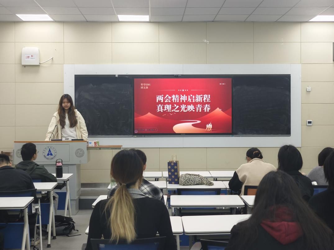 (学生通讯员:龚婷 吴子敬)近期,十四届全国人大三次会议及全国政协十四届三次会议在北京胜利召开,“两会精神”再一次成为社会讨论与学习的热点。为深入学习贯彻习近平总书记在全国两会期间的重要讲话精神,强化思想政治引领,哲学2301团支部于3月26日在文波楼110教室举办了以“两会精神启新程,真理之光映青春”为主题的团日活动。本次会议由团支书孟才雅主持。