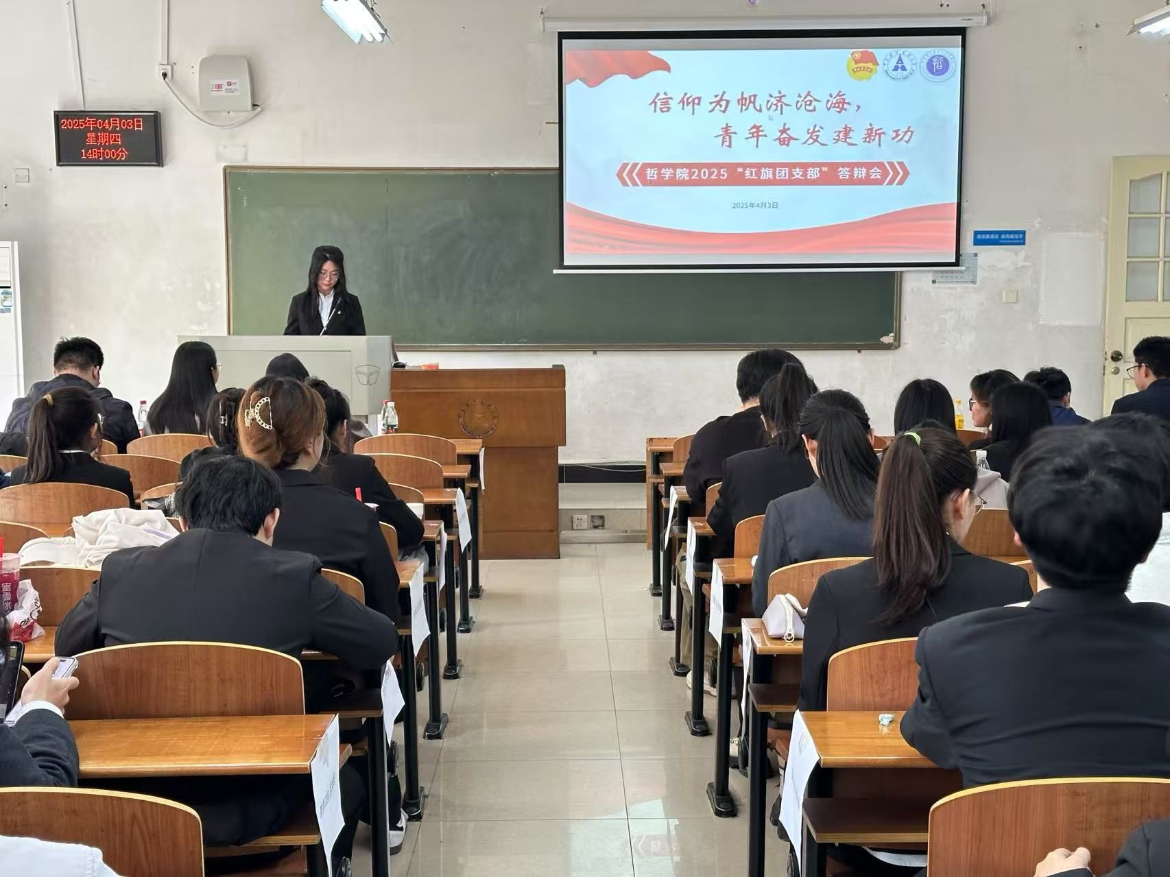 (学生通讯员:林佳淇/摄影:杨舒婷)为引导广大青年团员坚定理想信念,把握各支部的思想动态与成长情况,进一步发挥先进典型的示范带动作用,哲学院于2025年4月3日下午14:00在文澜楼108教室开展2024-2025学年“五四”综合表彰“红旗团支部”答辩会暨团支书述职大会。第十五届哲学院分团委副书记王瑾瑾、哲学院国际政治2101班原团支书薛智宝、第十六届哲学院分团委副书记杨冰冰担任评委,大一至大三各团支部团干们参加了此次会议。会议由团委组织部干事林佳淇主持。