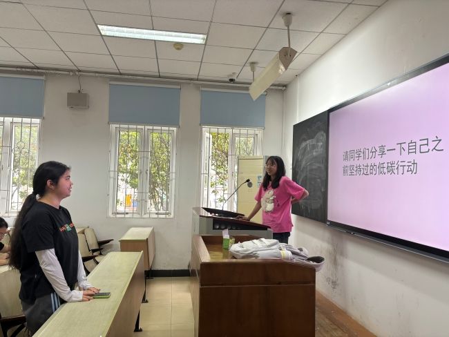 在“低碳行动分享”环节,支部成员结合日常生活,踊跃发言。有同学提到坚持步行上下学,减少碳排放;有同学分享自带环保餐具、减少外卖包装的经验;还有同学倡议通过旧物改造践行循环理念。大家一致表示,绿色生活并非宏大口号,而是“衣食住行”中的点滴积累,需以行动带动更多人参与。