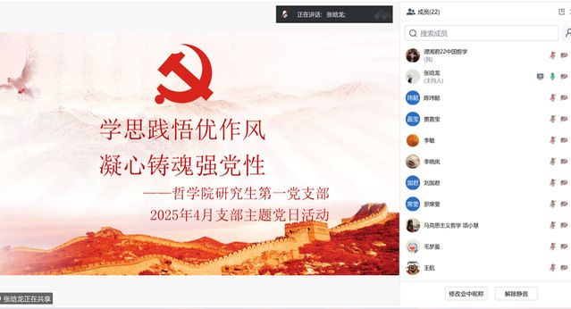 (通讯员 谭湘君)2025年4月30日下午,哲学院研究生第一党支部线上开展“学思践悟优作风,凝心铸魂强党性”主题党日活动。会议由支部书记张晗龙主持,全体党员参加。