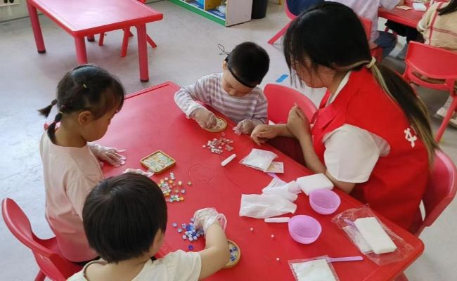 活动当日下午2点,志愿者们身着统一马甲,以“手势问候”开启了与聋儿的初次互动。一系列简单的肢体语言逐渐消融了孩子们的拘谨,孩子们眼中的陌生感渐渐转化为好奇与期待,建立起了彼此的信任与友谊。在随后的手工教学环节中,志愿者们分组手把手指导孩子们制作杯垫和发卡,活动室里洋溢着喜悦。活动尾声,志愿者们将自己亲手制作的小手工作为礼物送给了这些可爱的孩子们,捧着礼物的孩子们露出真诚的笑容,让人真切的感受到志愿服务不是单向的给予,而是一场温暖的双向奔赴。