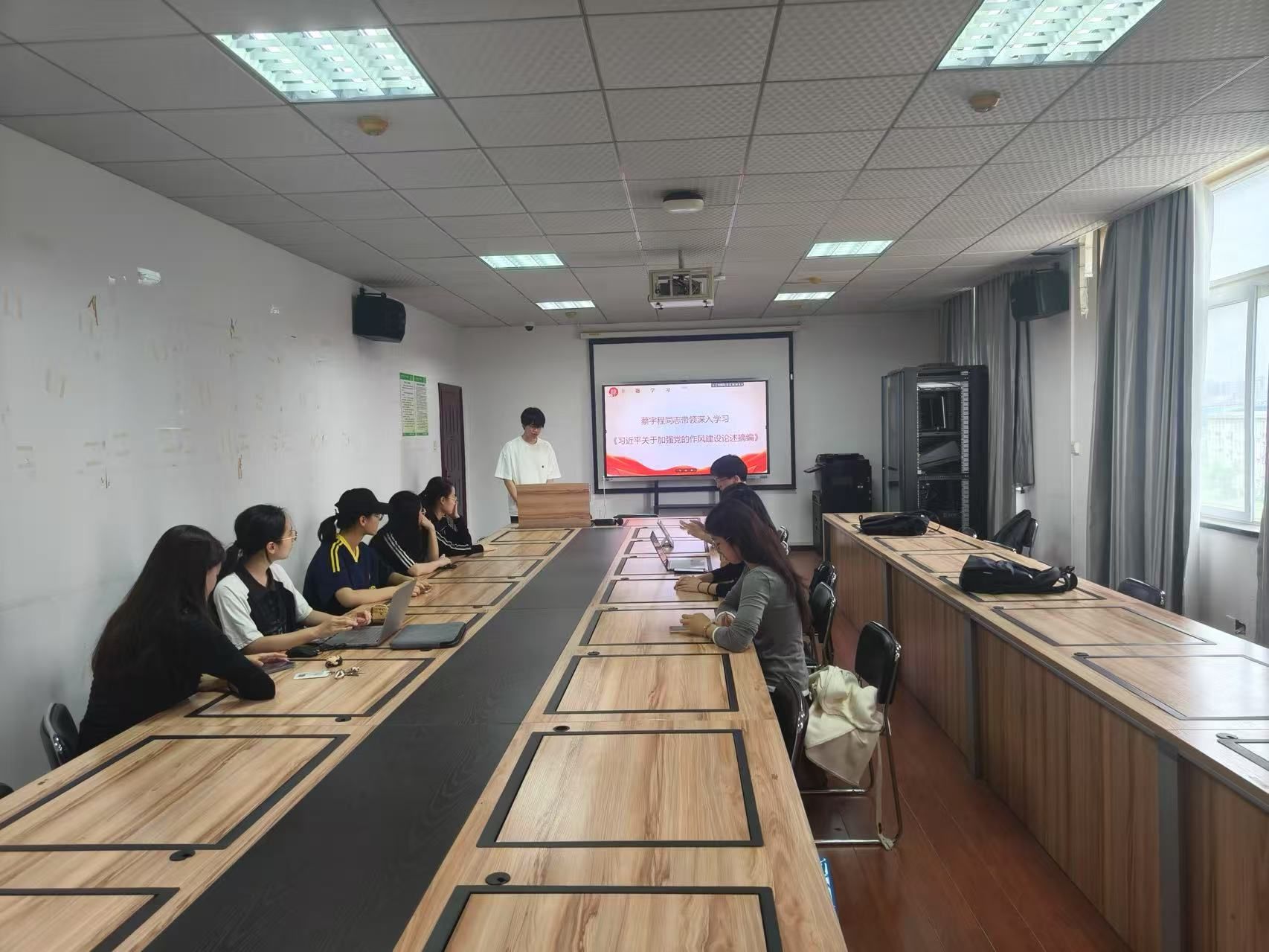 在主题学习环节,蔡宇程同志带领深入学习了《中国共产党章程》(第一章 党员)和《习近平关于加强党的作风建设论述摘编》,强调要加强支部内成员作风建设,提高工作效率,履行学生党员职责。然后由韩佳益同志带领学习了《国务院办公厅关于加快构建普通高等学校毕业生高质量就业服务体系的意见》,旨在帮助支部成员为未来就业指明方向,响应国家号召提高就业水平。最后由禹亭含同志带领学习了《习近平:朝着建成科技强国的宏伟目标奋勇前进》,指出学生党员应投入创新中去,为国家发展增添新动力。