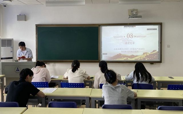 会议开始,在刘洳君同志的领誓下,全体党员面向党旗,集体重温入党誓词;由裴祎博同志诵读、领学《中国共产党章程》(第四章党的地方组织)。