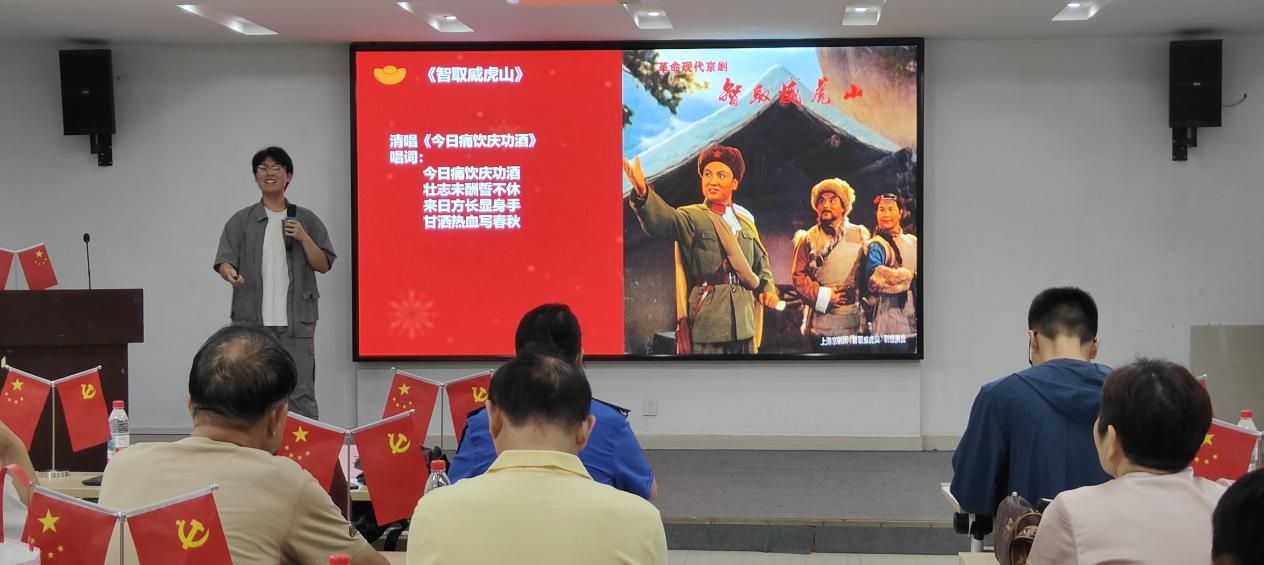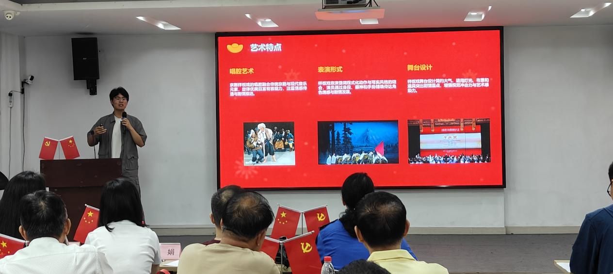 在背景概述和文化特色环节,志愿者介绍了京剧的起源发展及“样板戏”的诞生条件和艺术特点,向社区党员提供了“样板戏”的相关背景,引起了党员们的强烈共鸣。