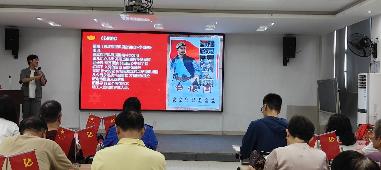 在剧目赏析阶段,志愿者选取了经典现代革命剧目《节振国》“看红旗迎风展指引咱斗争方向”片段,通过现场演唱,向观众介绍了抗日民族英雄、一位普通的矿工工人节振国的故事,博得了现场观众的阵阵掌声,传递了节振国忠诚于党、报答于党的爱党爱国精神。