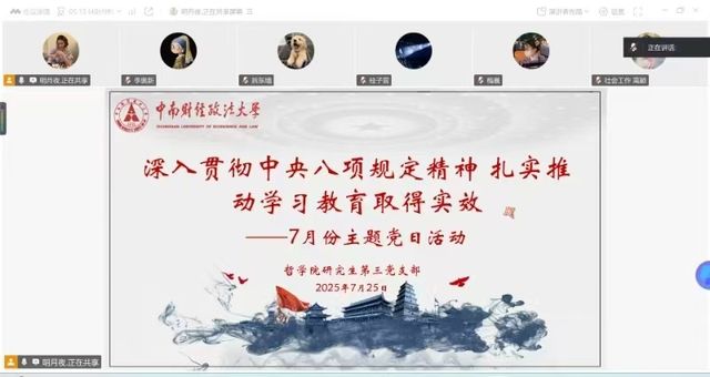 (通讯员 李奥新)2025年7月25日晚,哲学院研究生第三党支部在腾讯会议平台开展“深入贯彻中央八项规定精神 扎实推动学习教育取得实效”主题党日活动。会议由研究生第三党支部书记孙诤诚同志主持,支部全体党员参加会议。