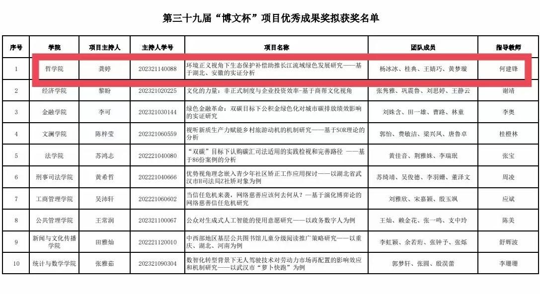 近日,第三十九届“博文杯”大学生百项实证创新基金项目评审结果正式揭晓,我校共评选出10项优秀成果奖。哲学院“环境正义视角下生态保护补偿助推长江流域绿色发展研究——基于湖北、安徽的实证分析”从189个项目中脱颖而出,荣获“优秀成果奖”。