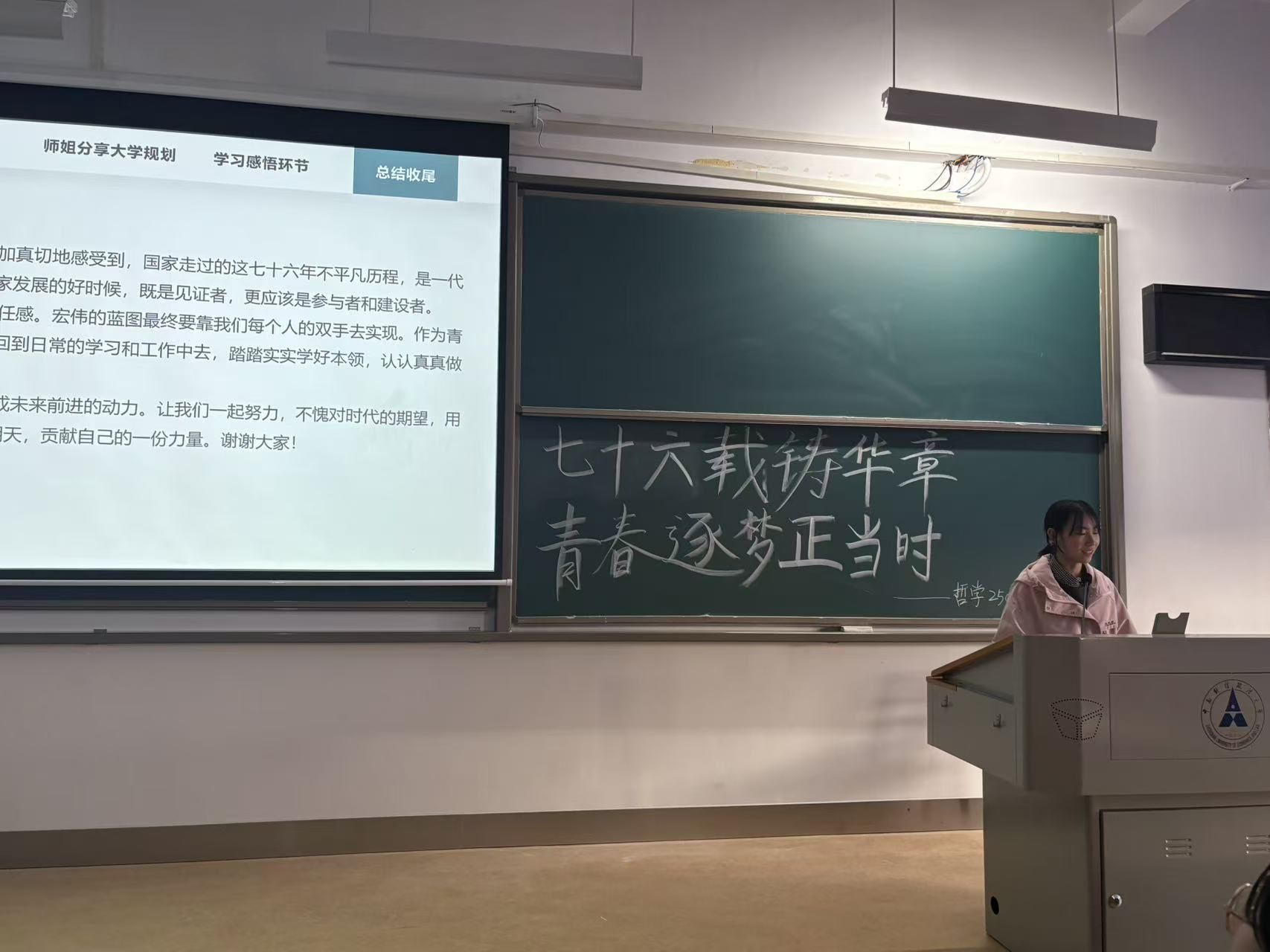 在学习感悟环节,团支书张静静围绕“七十六载发展历程与当代大学生的青春担当”的主题发言,号召同学们将个人梦融入中国梦,以实干诠释青春价值。随后,易佳琪、李帆和万秀鑫同学主动分享学习感悟,结合自身成长经历畅谈对责任、理想与奋斗的理解,表达了坚定信念、砥砺前行的决心。